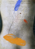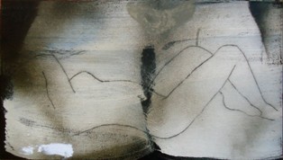 身体質感や宇宙空間の下地を作り上げ、暗色のぼかし技法で身体の断片シルエッットや宇宙の星屑を描き出している。