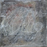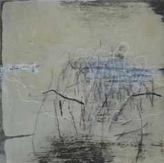 「水の中の花2」 2012 220×220o パネル、綿布、和紙、アクリル、WAX、岩絵の具、銅版インク